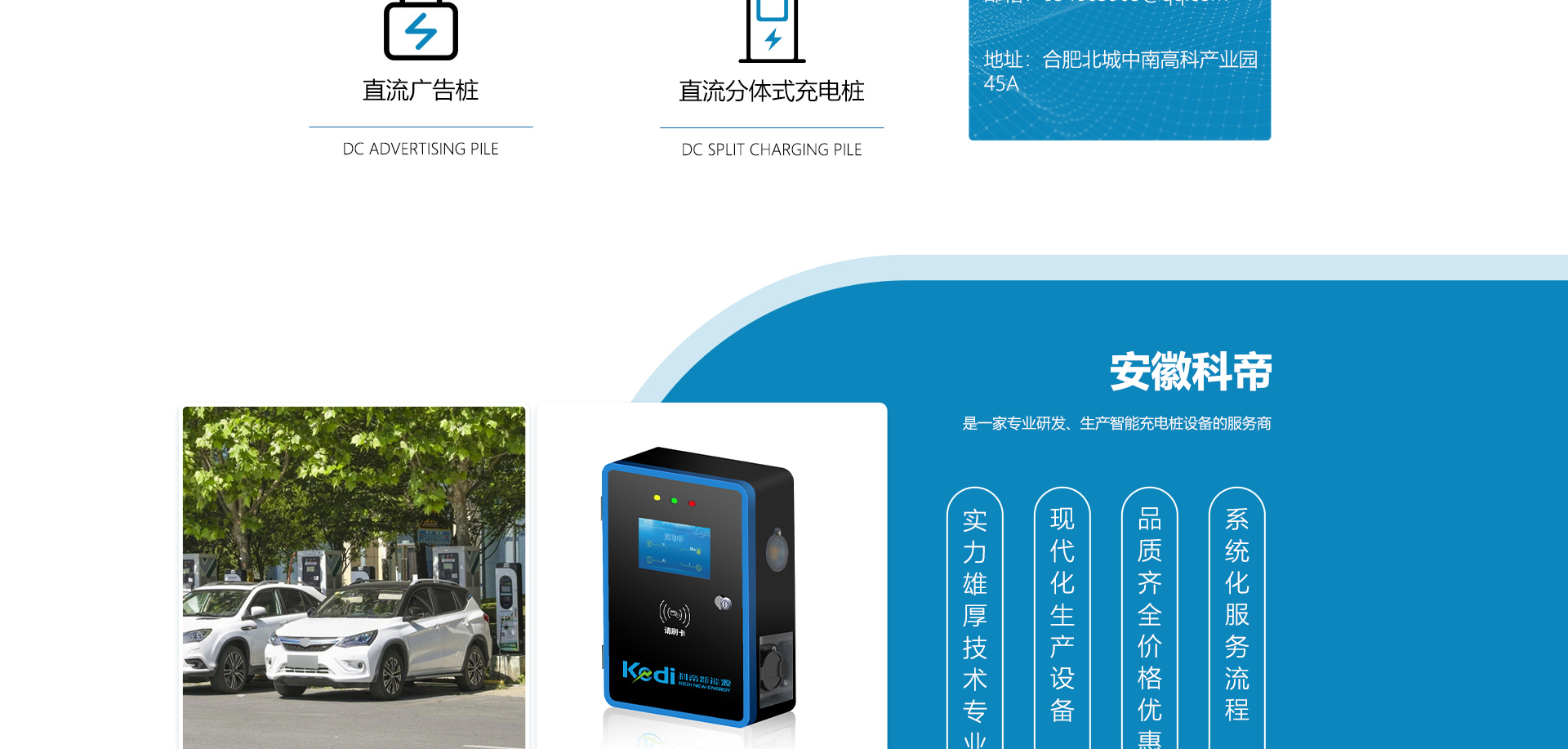 安徽科帝新能源科技有限公司坐落于安徽省會-合肥,是一家研發、生產智能充電樁設備,汽車充電站后臺監控管理系統和生產高壓開關設備的企業.由專門的研發團隊、管理團隊按照現代化企業制度規范設立的有限責任公司。致力于為能源智能、安全的應用和節能減排提供整體的技術與產品解決方案??频奂邪l、設計、生產、銷售以及服務于一體,在電動汽車充電方案,充電設施建設和城市配電方面擁有廣泛的技術研究及經驗積累,為客戶提供安全、智能的充電設備及充電運營站建設一體化解決方案。并堅持以人為本、質量為先、顧客至上、不斷創新”的企業理念,為能源行業的發展、節能減排做出重大的貢獻。公司擁有豐富的產品種類,目前科帝已研發生產了三十多種產品,充電設備有直流一體式充電樁、直流分體式充電樁、直流廣告樁、交流廣告樁、廣告一體樁、壁掛交直流樁;等多種充電設備;每一款產品都是精心打造,力求為客戶提供優越的用戶體驗。展望未來科帝將通過持續的自...